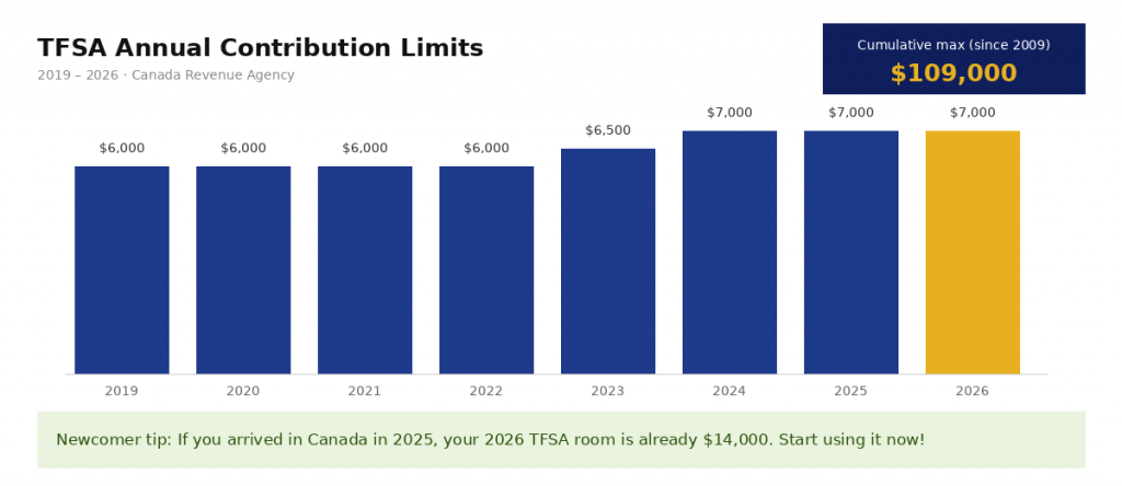 So if you arrived in Canada in 2025, your total TFSA room in 2026 is already $14,000.